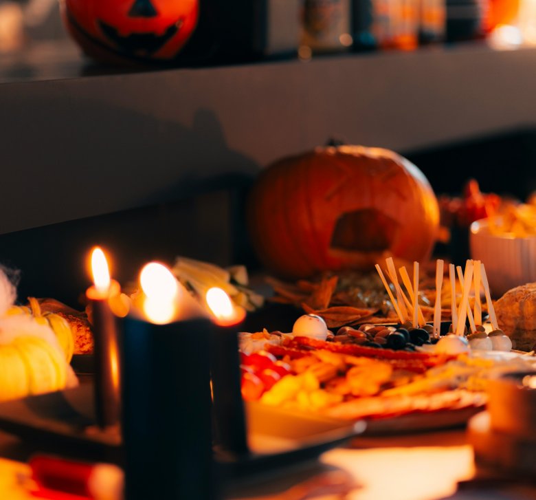 Use black tablecloths, orange napkins, and silver cutlery. Scatter autumn leaves, conkers, and mini gourds as natural centrepieces.